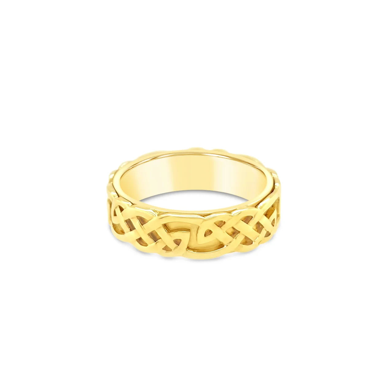 14k yellow gold "Infinity" Celtic knot design eternity band with a brightly polished design & contrasting matte background.