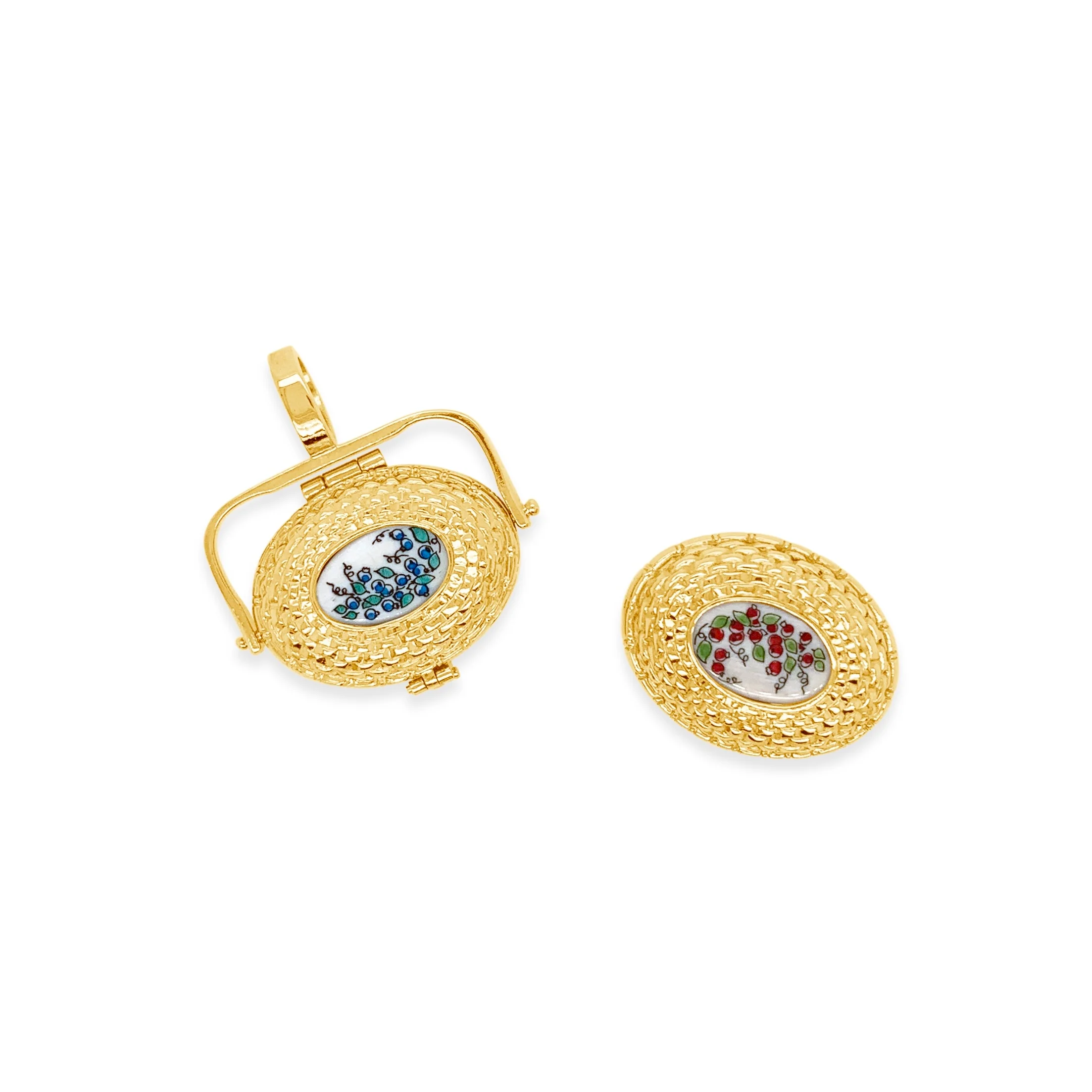 In the style of the Nantucket lightship baskets, this slide is a 14k yellow gold rendering of a woven basket top featuring a genuine scrimshaw inlay. Slides are best worn on an omega style necklace, heavy chain, or cord. A solid 7mm wide cross-bar secures the slide on the reverse.Ā
