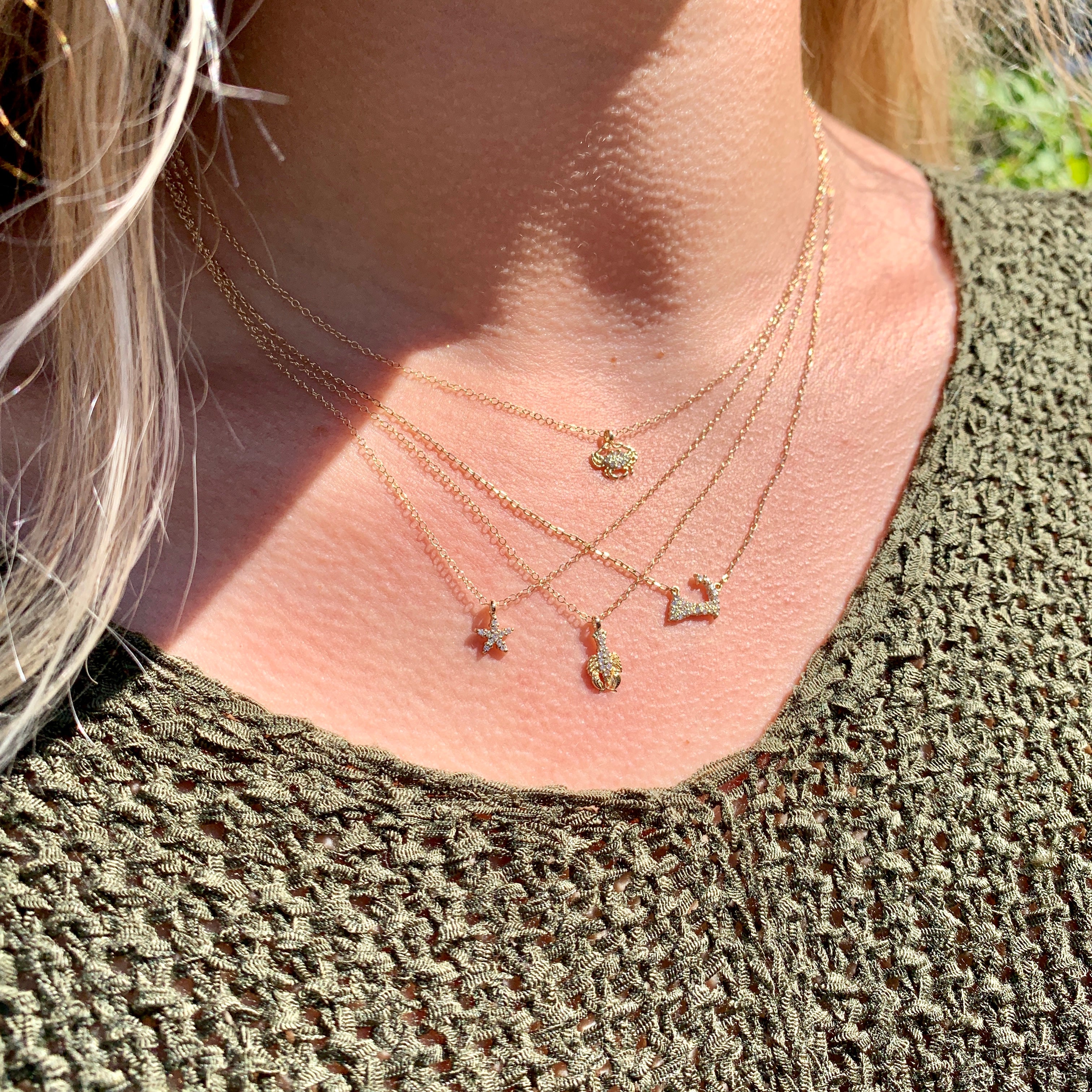 Our most lusted after mini pavé diamond Cape Cod map necklace is cast in 14k yellow gold and features an adjustable delicate cable chain which can be worn at either 16 or 18 inches. The perfect petite layering necklace and a sparkling reminder of the place we all love!